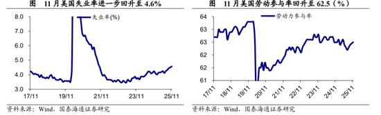 11月失业率回升幅度略超市场预期。11月美国失业率回升0.2个百分点至4.6%,略高于市场预期的4.5%。不过,失业率的上升或主要受劳动参与率回升的影响(11月劳动参与率回升0.1个百分点至62.5%)。具体来看,再次进入者与暂时性失业的增加是推升失业率上行的主要原因,永久失业人数的占比反而有所下降,一定程度上稀释了失业率上升的严重性。